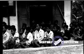 Anak-anak tidak ketinggalan dengan duduk diteras sebuah rumah tengah mengikuti dan mendengarkan pengarahan oleh tim penyuluh di Kepulauan Gili Raja Kabupaten Sumenep, 14 – 7 – 1956