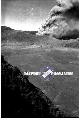 Asap mengepul dari kawah gunung bromo, sesuai dengan catatan sejarah pada tahun 1956 pernah terjadi erupsi namun tidak tercatat secara terinci, foto diambil dari cemoro lawang pada Kasada, 24 – 6 – 1956