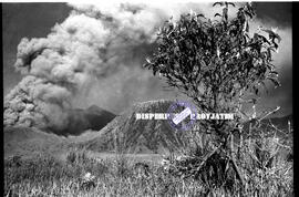 Asap mengepul dari kawah gunung bromo, sesuai dengan catatan sejarah pada tahun 1956 pernah terjadi erupsi namun tidak tercatat secara terinci, foto diambil dari lautan pasir pada Kasada, 24 – 6 – 1956