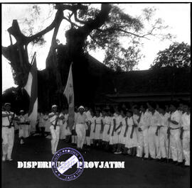 Barisan kontingen yang membawa bender a PON ketika berada di Surabaya untuk persiapan PON ke IV yang diselenggarakan di Makasar, 12 – 9 – 1957