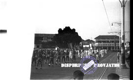 Barisan marcing band ikut memeriahkan acara rapat raksasa menuntut pembebasan irian barat di depan kantor gubernuran Surabaya, 10 – 11 – 1957