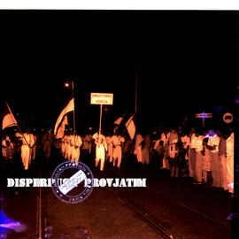 Barisan pemuda demokrat sedang mengikuti parade pada malam Peringatan HUT Kemerdekaan Republik Indonesia ke 12 di Surabaya, 17 – 8 – 1957