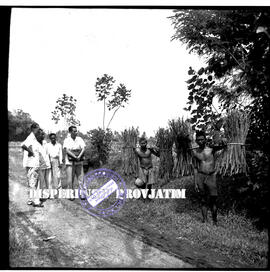 Beberapa anggota rombongan tengah berbicang-bincang dengan penduduk yang sedang memikul kayu bakar pada acara kunjungan anggota DPRDP meninjau HONGEROEDEEM. Penyakit busung lapar disebabkan karena kekurangan zat makanan yang disebut protein atau putih telur di Jember, 28 – 11 – 1956 .