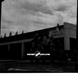 Item VI.69.3635 - Beberapa arek-arek Suroboyo sedang menaiki sebuah jeep yang menggambarkan drama teatrikal perobekan bendera di Hotel Majapahit / Yamato / Sarkies surabaya, 10 – 11 – 1969