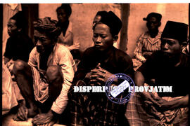 Beberapa orang lelaki tengah duduk sambil mendengarkan penyuluhan dan pengarahan dati tim penyuluh di Kepulauan Gili Raja Kabupaten Sumenep, 14 – 7 – 1956