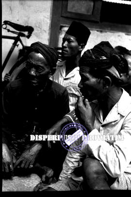Beberapa orang lelaki tengah duduk sambil mendengarkan penyuluhan dan pengarahan dati tim penyuluh di Kepulauan Gili Raja Kabupaten Sumenep, 14 – 7 – 1956
