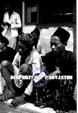 Beberapa orang lelaki tengah duduk sambil mendengarkan penyuluhan dan pengarahan dati tim penyuluh di Kepulauan Gili Raja Kabupaten Sumenep, 14 – 7 – 1956