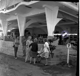 Beberapa orang turis mancanegara asyik bercengkerama di depan Hotel Tanjung, foto diambil pada kegiatan Promotion Tour di Prigen, Tretes, 10 – 9 – 1969
