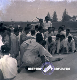 Beberapa peserta Kongres GMNI (Gerakan Mahasiswa Nasional Indonesia) sedang berdiskusi di bawah tugu pahlawan, nampak dengan latar belakang rek kereta api depan sebelah kanan kantor gubernuran jl pahlawan Surabaya, 18 – 11 – 1954