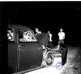 Beberapa warga sedang menyaksikan mobil yang ditumpangi mobil dr. Saleh setelah kejadian kecelakaan di peterongan Jombang, 7 – 6 - 1952