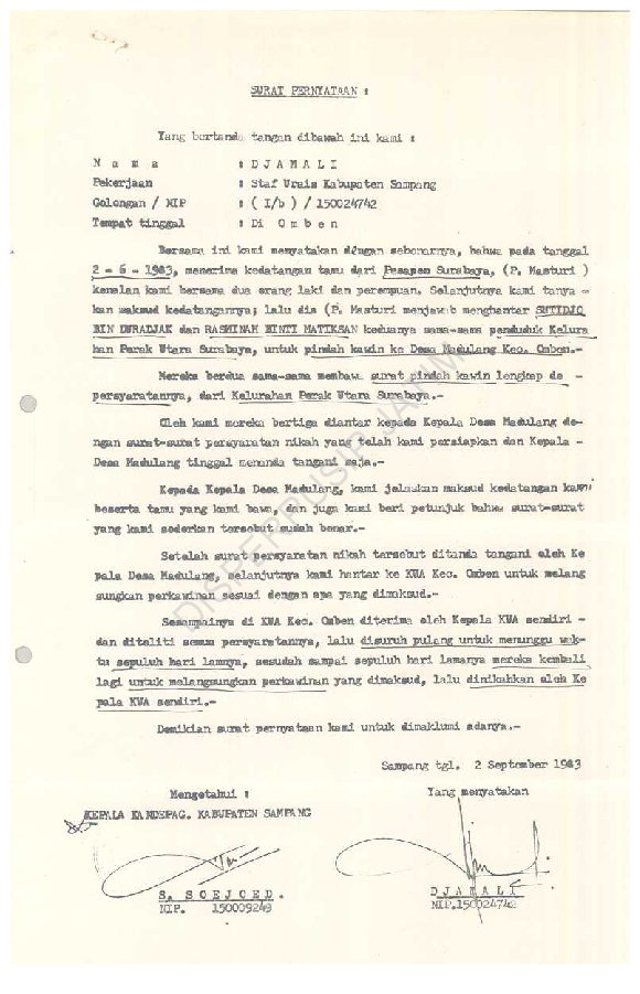 Berkas dari Bupati KDH TK II Sampang kepada Kepala kantor wilayah Departemen Agama Propinsi Jatim tentang kawin tanpa surat-surat keterangan dari Kepala Desa tgl 8 November 1983 5 lembar Baik (5)