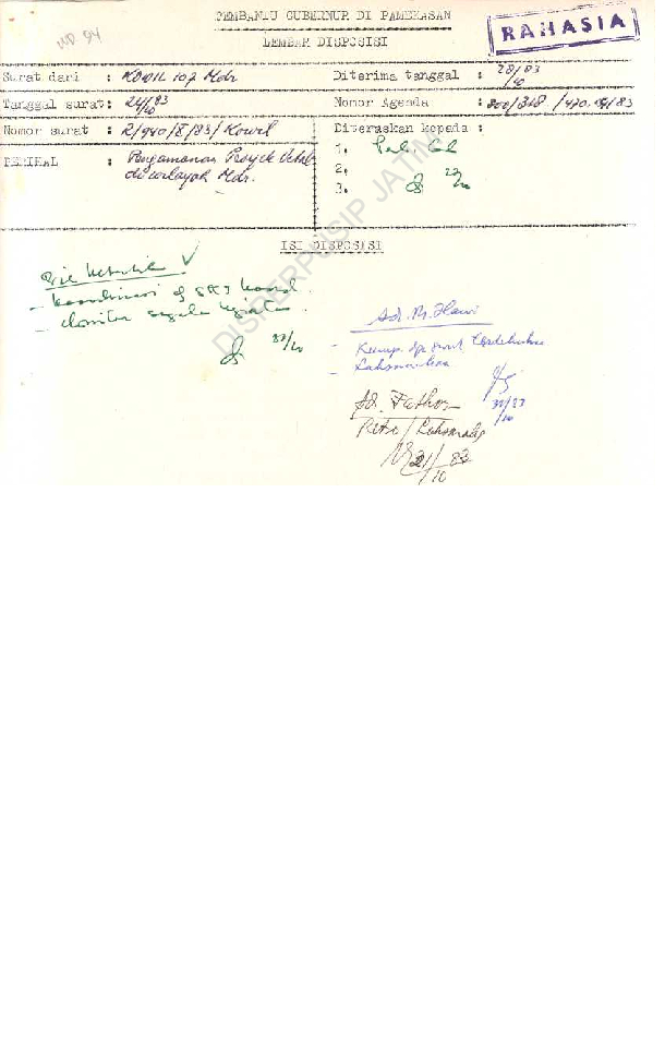 Berkas dari Dewan pimpinan cabang Orgamda Kab Datoi II bangkalan kepada bapak Bupati KDH TK II bangkalan tgl 11 Nop 1983 tentang penetapan harga pelaksanaan AVI/PMB 2 lembar Tembusan, baik (1)