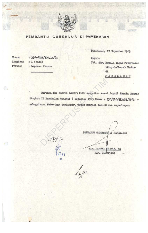 Berkas dari Gub KDH TK. I Jatim Asisten V Sewilda u.b.Kepala Biro Bina Pemerintahan tgl 10 Nop 1983 tentang laptan adanya pungutan perongkosan muatan sapi 7 lembar Baik (3)