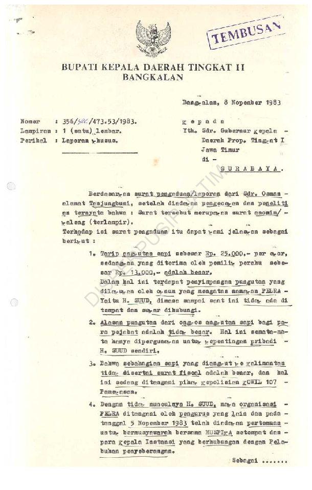 Berkas dari Gub KDH TK. I Jatim Asisten V Sewilda u.b.Kepala Biro Bina Pemerintahan tgl 10 Nop 1983 tentang laptan adanya pungutan perongkosan muatan sapi 7 lembar Baik (5)