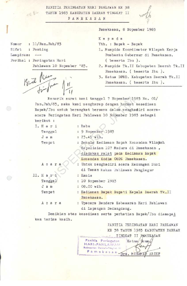 Berkas dari panitia peringatan hari pahlawan ke 38 tahun 1983 kabupaten dati. II pamekasan kepada muspida koordinator wilayah kerja pembantu gubernur di pamekasan tgl 8 november 1983 tentang peringatan hari pahlawan 10 november 1983 4 lembar Tembusan, baik (1)