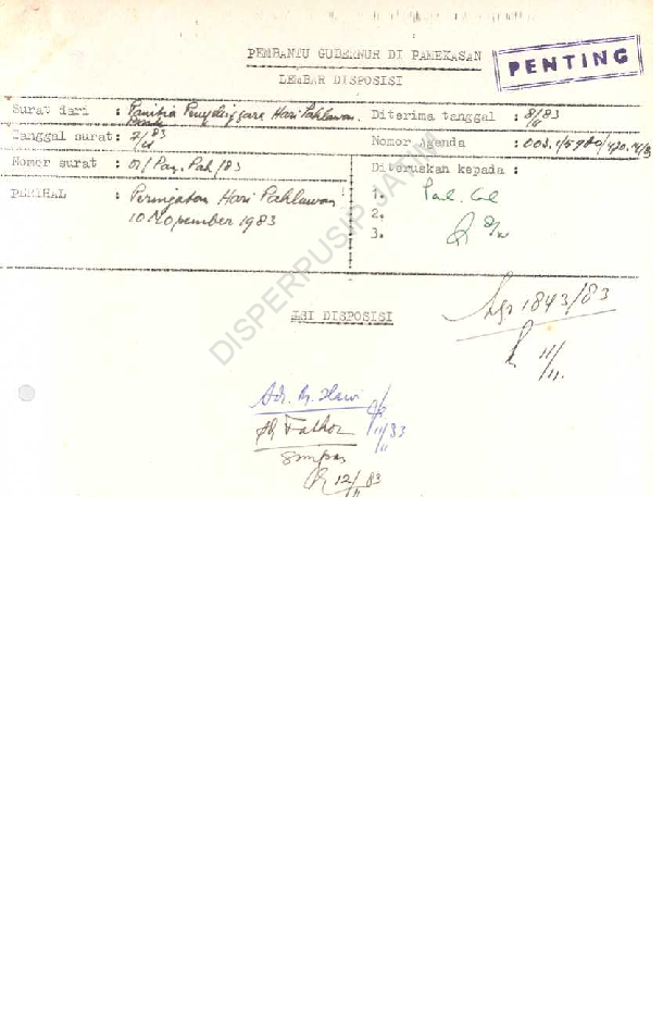 Berkas dari panitia peringatan hari pahlawan ke 38 tahun 1983 kabupaten dati. II pamekasan kepada muspida koordinator wilayah kerja pembantu gubernur di pamekasan tgl 8 november 1983 tentang peringatan hari pahlawan 10 november 1983 4 lembar Tembusan, baik (2)
