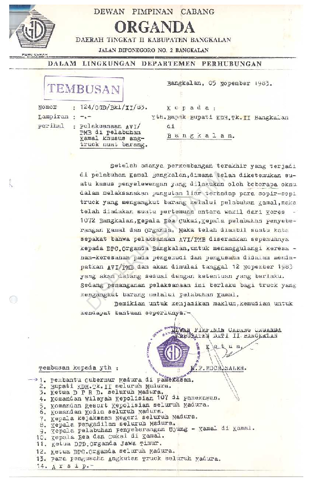 Berkas dari pembantu gubernur di pamekasan kepada gubernur KDH TK I Jatim kepala derektorat sospol di Surabaya tgl 17 november 1983 tentang pelaksana AVI / PMB di pelabuhan Kamal khusus angkutan truck muat barang 3 lembar Pertinggal, baik (3)