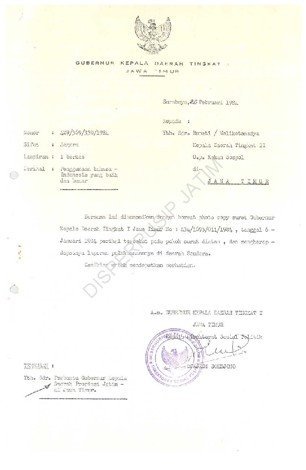 Berkas Gubernur KDH TK I Jatim kepada Bupati Walikotamadya KDH TK II up Kakanwil Sospol tentang penggunaan bahasa Indonesia yang baik dan benar tgl 20 Februari 1984 4 lembar Baik (2)