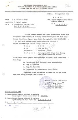 Dari Kepala Kantor Departemen Transmigrasi Blitar kepada Direktur Jenderal RAHBIN transmigrasi Jakarta tentang transmigrasi PNS an. Sdr. Lono dari Blitar ke PI Karang Agung Tengah Sumatera Selatan.