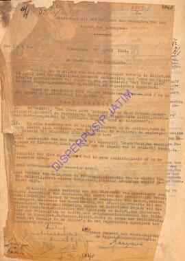 De regent van ngandjoek, aan den gouverneur van oost java te soerabaja, ngandjoek, 20 April 1934, anderwerp gelezen het schrijven van den provincialen veearts te kediri dd. 14 April 1934 no. 622 houdende mededeeling dat "mond en klauwzeer" is geconstateerd bij runderen van de melkerij "oei thwan liem" te desa pajama regentschap ngandjoek