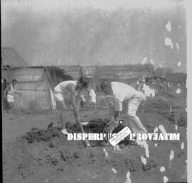 Dua orang lelaki sibuk menggali tanah dalm bhakti dalam rangka memperingati hari sumpah pemuda, 23 – 10 – 1958