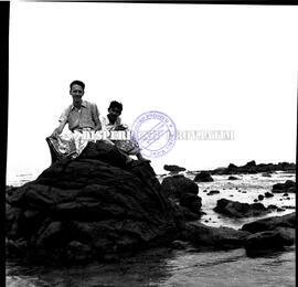 Dua orang lelaki tengah duduk santai diatas batu sambil menikmati keindahan pantai blambangan, 2 s.d 5 – 5 – 1956
