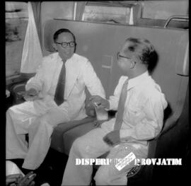 Dua orang pejabat sedang berbincang-bincang di dalam gerbong kereta api saat acara percobaan kereta api dingin jurusan Surabaya – Malang, 28 – 9 – 1954