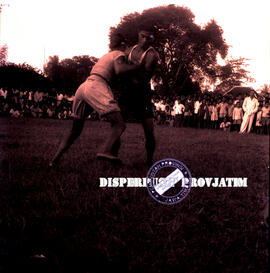 Dua orang pemuda melakukan pertunjuan kesenian gulat tradisional ( Gellok-gellok an ) di pulau Kangean, Tahun 1957