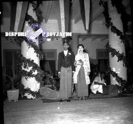 Fashion show dengan mengenakan pakaian pengantin adat jawa pada malam amal penggalangan dana bantuan korban banjir (tahun 1955 diperkirakan banjir bandang di tulungagung) di kantor gubernuran grahadi surabaya, 15 – 4 – 1955