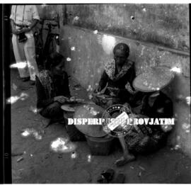 Foto 3 orang ibu-ibu selesai menjual dagangannya, foto diambil setelah kejadian gempa bumi yang melanda Malang, Tulungagung dan Blitar, 23 – 10 – 1958