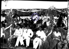 Gubernu jawa timur Samadikun tampak duduk di depan bersamaan dengan pejabat yang lainnya pada rapat raksasa PNI (partai nasional indonesia) di Surabaya, 30 – 1 – 1955
