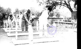 Gubernur R. Soewondo Ranoewidjojo beserta para perwira dan pejabat lainnya melakukan tabur bunga di Taman Makam Pahlawan pada upacara peringatan Hari Pahlawan di Lapangan Tugu Pahlawan, Surabaya, 10 – 11 – 1960