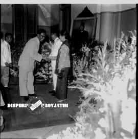 Gubernur Samadikun beserta istri sedang menerima tamu undangan Malam Peringatan HUT Kemerdekaan Republik Indonesia ke 12 di Surabaya, 17 – 8 – 1957