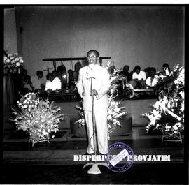 Gubernur Samadikun sedang memberikan sambutan pada kongres pengusaha tembakau se indonesia di surabaya, 23 – 8 – 1957