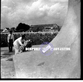 Gubernur samadikun tengah meletakkan karangan bunga di tugu pahlawan pada Peringatan HUT Kemerdekaan Republik Indonesia ke 11 di Surabaya, 17 – 8 – 1956