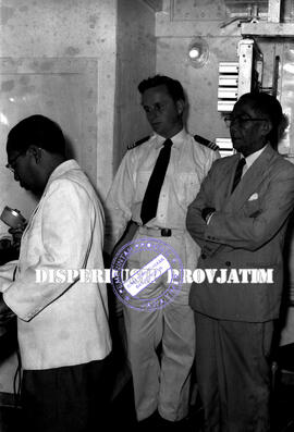 Gubernur Samadikun terlihat berdiri di dalam kapal tampomas didampingi oleh seorang nahkoda sedang melakukan panggilan radio S.S. Tampomas PT. PELNI (Pelayaran Nasional Indonesia) , 18 – 9 – 1956