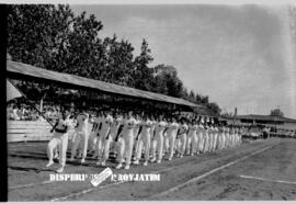 Iring-iringan kontingen atlit ketika melintas di depan panggung kehormatan pada acara ulang tahun RRT (Republik Rakyat Tiongkok) di Surabaya, 1 – 10 – 1955
