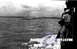 Kapal yang mengangkut rombongan peninjauan ketika akan merapat di sebuah pelabuhan Giliketapang Probolinggo, tampak di atap sebuah bangunan di pelabuhan terlihat tulisan ESSER (sebuah perusahaan angkutan laut) - 3 – 1955