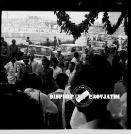 Item VI.58.2474 - Kedatangan Presiden Sukarno pada rapat raksasa aksi pembebasan irian barat, terlihat Presiden Sukarno turun dari iring-iringan rombongan pengawal di depan kantor gubernuran di Surabaya, tahun 1958