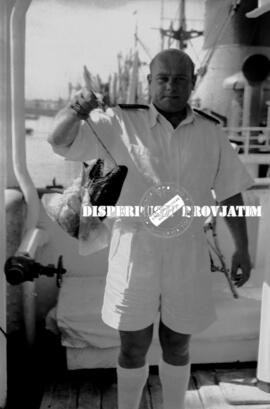 Kedatangan zeeleeuw (singa laut) untuk menlengkapi koleksi kebun binatang surabaya, seorang kapten kapal laut sedang menunjukan singa laut yang tengah dibius, 8 – 3 – 1956