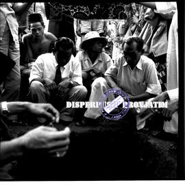 Item VI.56.1472 - Keluarga dan pelayat terlihat duduk di pinggir liang lahat, Pemakaman Ny. Saniroon, 14 – 8 – 1956