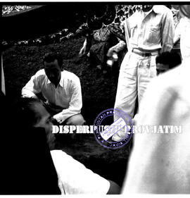 Keluarga terlihat duduk di pinggir liang lahat, Pemakaman Ny. Saniroon, 14 – 8 – 1956