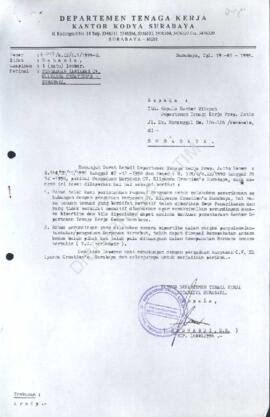 Kepala kantor Departemen Tenaga Kerja Kodyamadya Surabaya : Surat kepada Kepala Kantor Wilayah Departemen Tenaga Kerja Propinsi Jawa Timur tentang penyelesaian pengaduan karyawan CV. Euyana Creationis Surabaya
