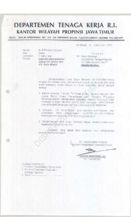 Kepala Kantor Wilayah Departemen Tenaga Kerja Propinsi Jawa Timur : Surat kepada Direktur Jendral Binawas Departemen Tenaga Kerja R I di Jakarta tentang laporan penyelesaian pengaduan eks karyawan CV. Classic dan CV. Setia Bhakti a.n. Sdr. Samsul Hidayat