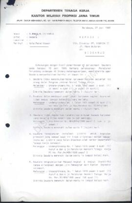 Kepala Kantor Wilayah Departemen Tenaga Kerja Propinsi Jawa Timur : Surat kepada Direktur PT. Maspion II di Sidoarjo mengenai Nota Pemeriksaan tentang pelaksanaan peraturan perundang-undangan di bidang ketenagakerjaan