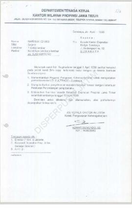 Kepala Kantor Wilayah Departemen Tenaga Kerja Propinsi Jawa Timur : Surat kepada Kepala kantor Departemen Tenaga Kerja Kodyamadya Surabaya tentang laporan kelebihan jam kerja lembur an. Sugihartono karyawan UD. Sultraco Surabaya