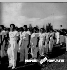 Kontingen bintang timur peserta gerak jalan 15 km tengah bersiap di sebuah lapangan di Surabaya untuk pemberangkatan, 11-6-1955