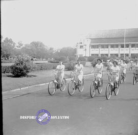 Kontingen lomba rapi dan keserasian bersepeda dengan peserta kelompok putri pada peringatan hari kartini, start di Halaman Balai Kota / Kotamadya Surabaya 21 – 4 – 1953