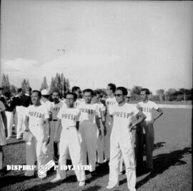 Kontingen pers peserta gerak jalan 15 km tengah bersiap di sebuah lapangan di Surabaya untuk pemberangkatan, 11 – 6 – 1955