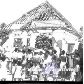 Kunjungan para pejabat meninjau lokasi gempat, terlihat sebuah rumah dengan genting yang berantakan, foto diambil setelah kejadian gempa bumi yang melanda Malang, Tulungagung dan Blitar, 23 – 10 – 1958